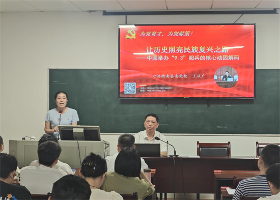 2025年9月11日,衡南县委党校机关支部与中青班临时支部联合开展“铭记抗战历史·凝聚奋进力量”纪念中国人民抗日战争暨世界反法西斯战争胜利80周年主题党日活动。活动通过观看阅兵回放、专题党课和研讨交流三种形式,让全体参与者接受了一次深刻的爱国主义教育和党性洗礼。