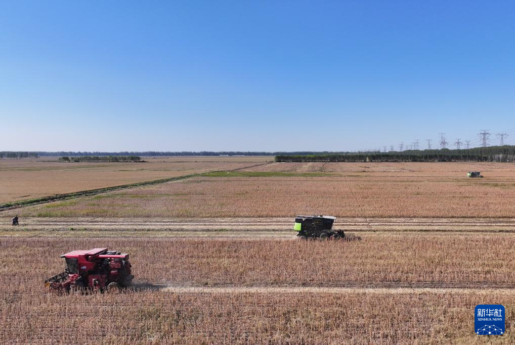 10月21日,收割机在天津市蓟州区下窝头镇收获大豆(无人机照片)。