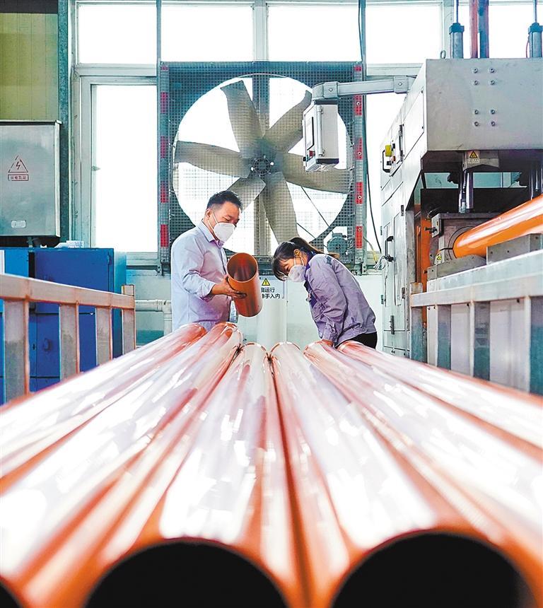 11月12日,工人在定安县海南联塑工厂生产车间检查管道。近年来,海南联塑通过数字化、智能化转型助推行业发展。
