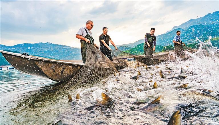 10月12日,工作人员在云阳县清水湖生态渔场捕捞作业。当地与科研院校合作,设立水环境保护与水产发展研究工作站,助力生态渔业绿色转型。