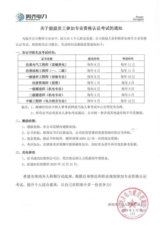 中国新报讯(特约记者 刘露 通讯员 肖英)根据“做专做精”的定位,近年来,湖南鸿齐电力建设有限公司直鼓励员工积极参加专业资格考试,不仅为持证人提供证书补贴,更在2025年3月发布《关于鼓励员工参加专业资格认证考试的通知》,明确对通过考试的人员给予额外奖金激励,以多重激励推动全员专业能力提升。