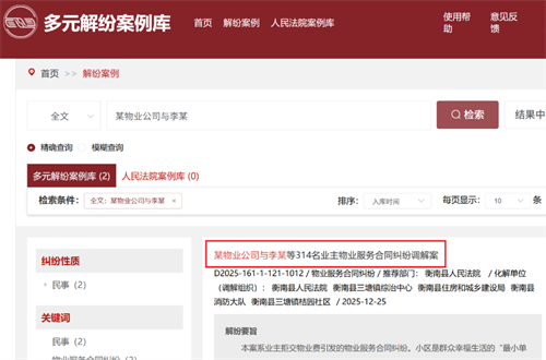 “多元解纷案例库”是由最高人民法院主导上线、面向社会公众开放的国家级平台。案例库重点收录各单位通过非诉讼方式成功化解矛盾的典型案例,旨在为各类社会主体开展纠纷化解工作提供实践参考,为人民群众选择调解等非诉讼解纷途径提供清晰指引,形成“一站式”纠纷化解参考服务体系。衡南县人民法院报送的《某物业公司与李某等314名业主物业服务合同纠纷调解案》与《费某与谢某等10名子女赡养纠纷调解案》两篇案例成功入选!