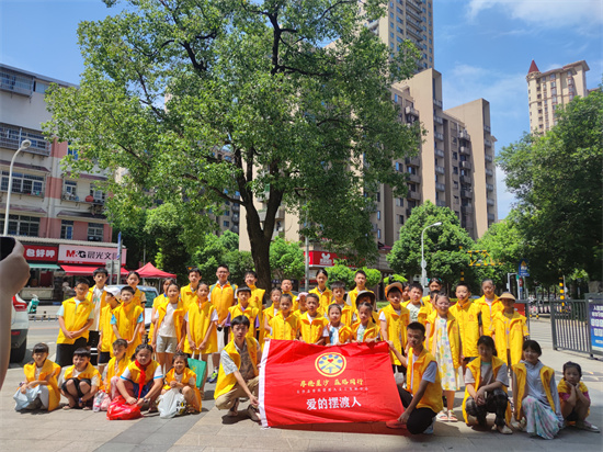7月12日上午,骄阳似火,芙蓉区东屯渡社区前坪涌动着阵阵温情。长沙县爱的摆渡人义工发展中心联合芙蓉区小桔灯少儿成长中心组织的40多名身着统一黄色义工服的小义工带着满满心意,为高温下坚守岗位的户外工作者送去夏日清凉。上午10时45分,签到台前已排起小长队,8岁的刘奕煊早早地提着装满5瓶矿泉水的小背包,拉着爸爸的手来到了活动现场。孩子们穿上义工服,稚嫩的脸上写满了对活动的期待。