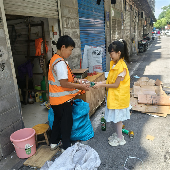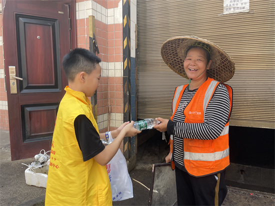 活动正式开始前进行了宣讲环节,活动负责人胡芬现场提问孩子们:“你们谁知道烈日下有哪些工作人员在为我们服务呀?”“交警叔叔!”“外卖小哥!”“环卫工人!”……孩子们争先恐后地举手,清脆的声音里满是笃定。分组行动的指令一发出,小义工们便按捺不住热情。高岭小区组的孩子们沿着人行道仔细搜寻。“大爷,您辛苦了,请喝瓶水吧!”小义工郭笑含看到一位正推着垃圾车的大爷,追上去,立刻双手递上矿泉水。大爷愣了一下,随即笑着接过,一边用肩上的毛巾擦着额头的汗珠,一边说:“谢谢你哟,小朋友。”
