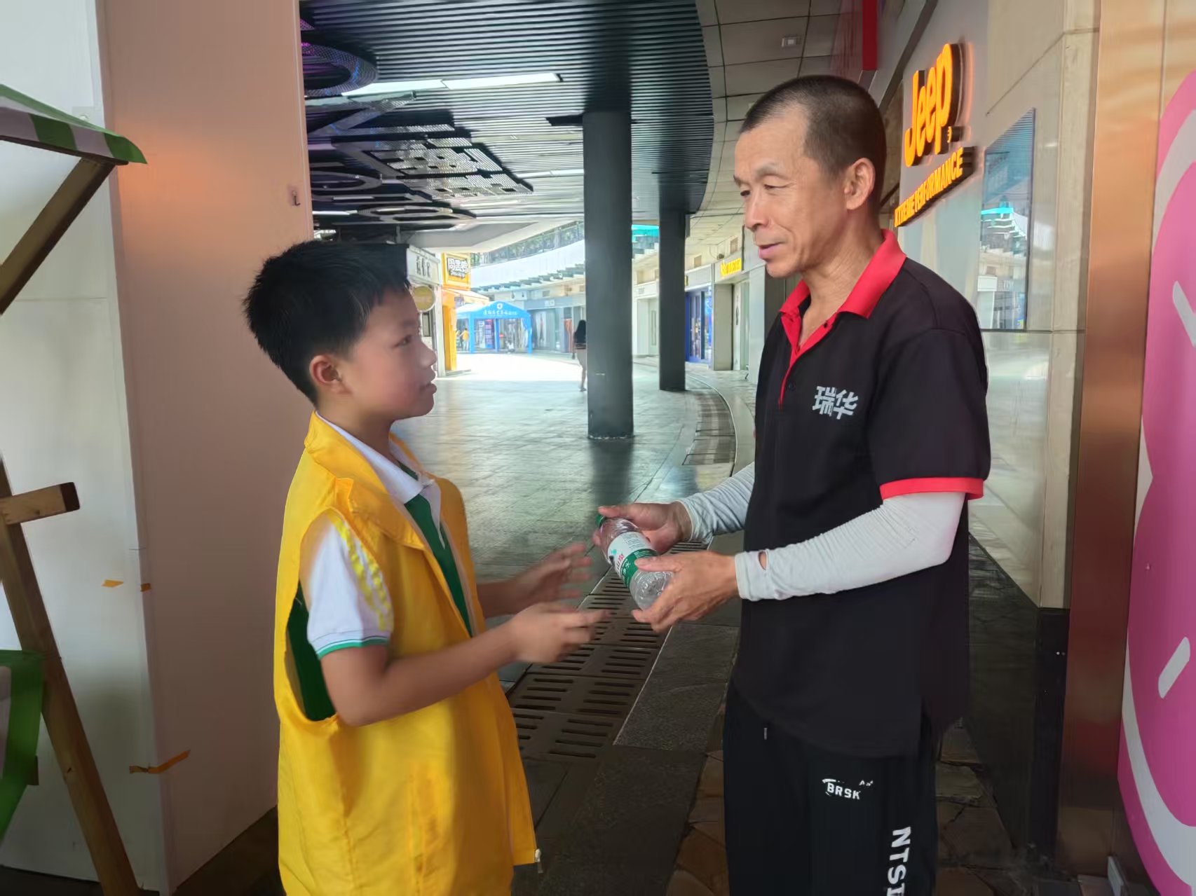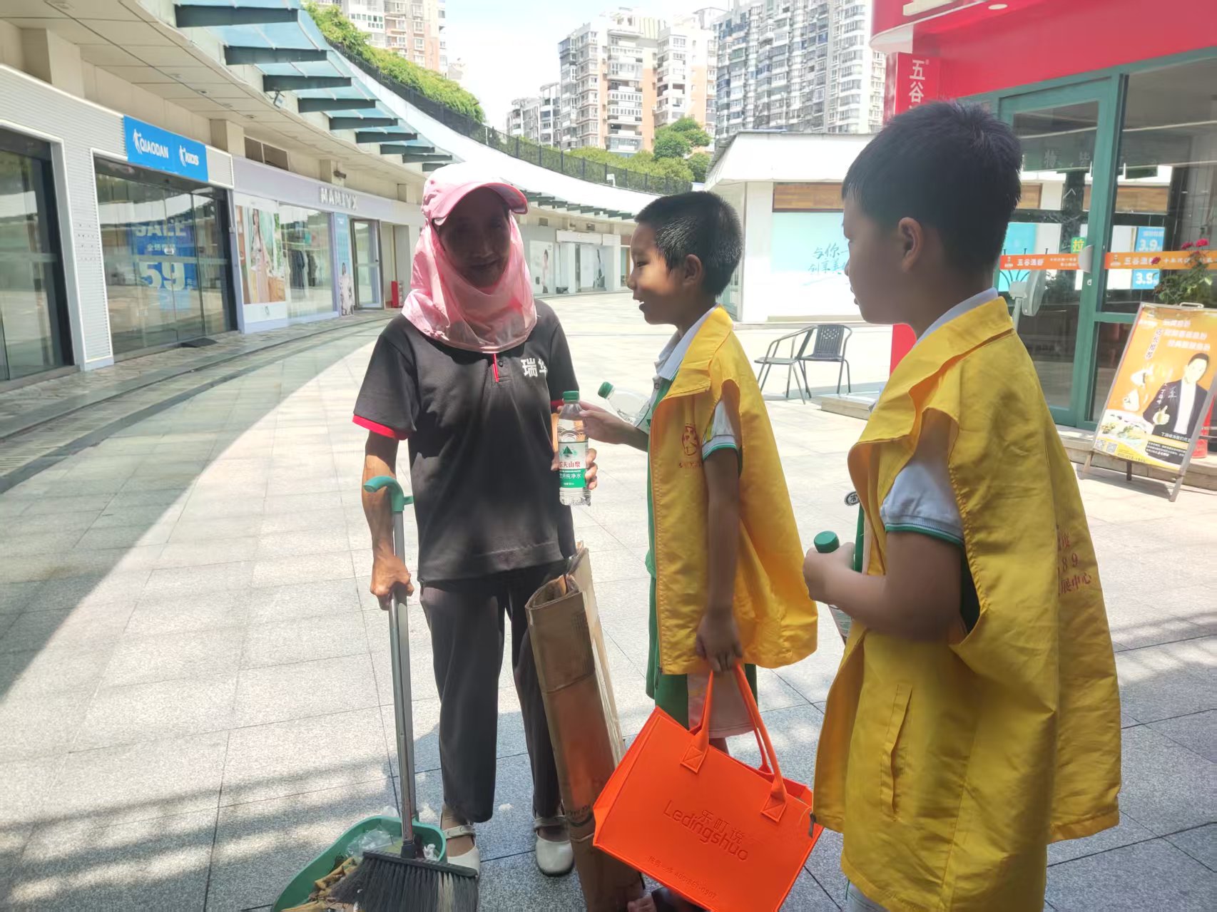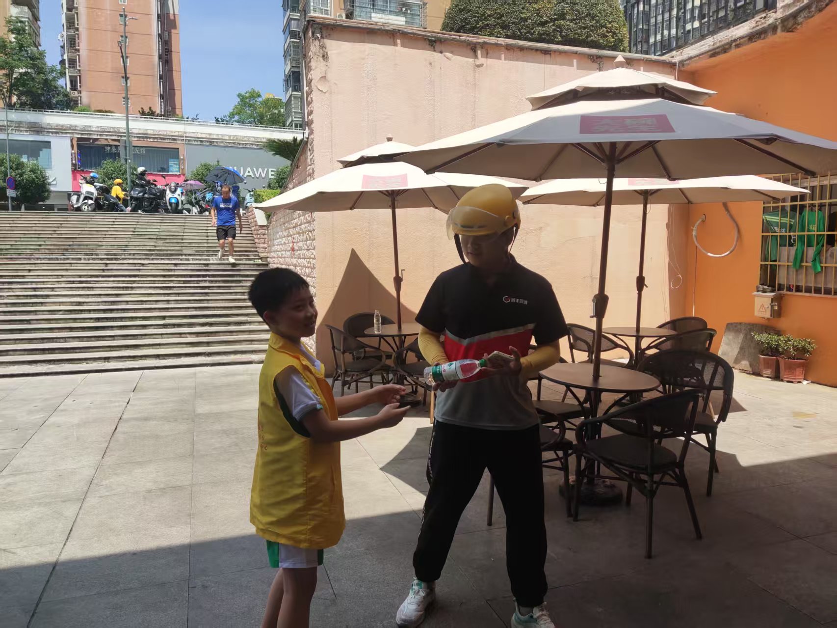 学生们青春的身影活跃于热浪之中,寻访着烈日下坚守的身影:环卫工人汗湿衣襟却依然紧握扫帚;快递小哥在蒸腾的热气中争分夺秒奔忙;建筑工人黝黑的面庞上汗珠滚落……当学生们将承载敬意的清凉之水递上,环卫师傅王大姐一面擦拭汗水,一面动情地说:“这水甜到心里去了!孩子们真好!”一位快递小哥也禁不住感慨:“这么热的天,孩子们真有心,谢谢你们!”