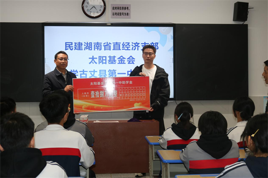 在随后的捐赠仪式上,民建湖南省直经济支部、太阳基金会分别为该校捐赠慈善奖学金9万元、助学金18万元,给原思源281班的同学们捐赠了学习、生活用品。该校相关负责人对捐赠方深深地感谢并表示,这份沉甸甸的礼物,对同学们不仅是物质上的支持,更是精神上的激励;这份善举同学们要牢记于心,内化于行,成为人生前进的不竭动力;这份爱心同学们要深受启发,有所思考,励志前行,成长成才。民建湖南省直经济支部、太阳基金会相关负责人表示,将会持续关注该校教育事业发展和学生健康成长,积极履行社会责任,为促进教育公平、助力乡村振兴、学生健康成长贡献力量。