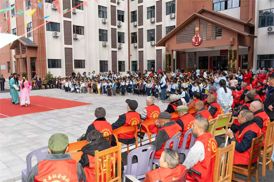 文艺汇演环节更是精彩纷呈,为现场观众带来一场视听盛宴。爱堡贝幼儿园的老师们率先登场,以一支活力四射的开场舞点燃全场气氛,灵动的舞姿展现出青春朝气;特邀赞助单位新宁县崀韵文化传媒演艺有限公司则带来传统戏曲与非遗文化表演——黄梅戏选段《路遇》韵味悠长,让老人们重温经典;渔鼓表演《十劝戒赌》生动鲜活,尽显非遗魅力;最后登场的花鼓戏《家和万事兴》更是诙谐有趣,引得台下掌声与笑声不断。
