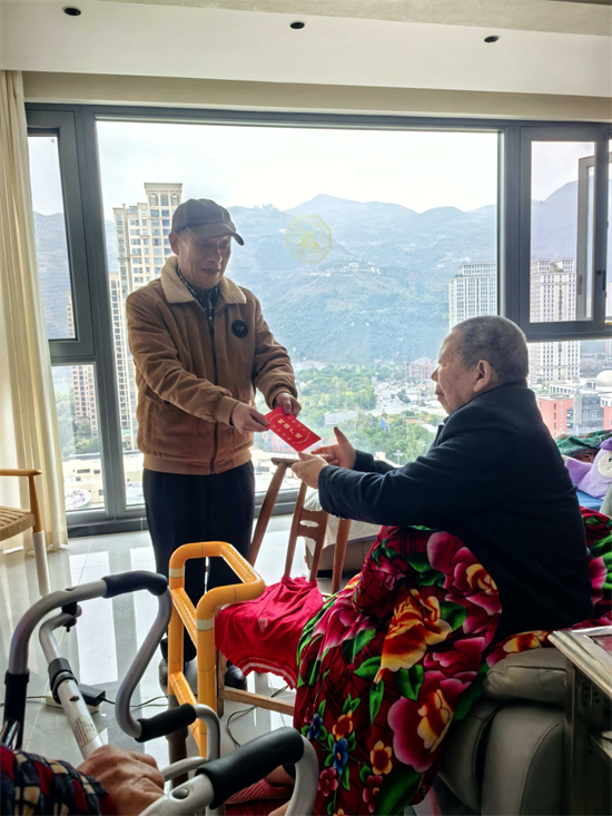 本月22日清晨,慰问组一行趋车来到来到位于西部新区胡家村居民房的“西辰御府”3幢11一13号楼陈永杰家。原奉节师范学校校长陈永杰,现年84岁,他于2016年因脑出血导致偏瘫座在轮椅上,看到慰问组一行的到来时,陈老和他老伴流着眼泪不约而同地拱手地说:“真是谢谢你们。”慰问组的组长又再三叮嘱老人积极配合治疗,安心养病,保持乐观心情,争取早日康复。