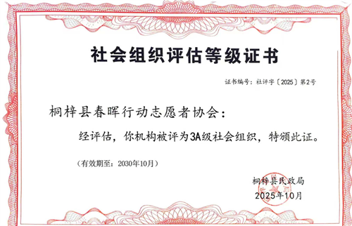 中国新报讯((特约记者 谢泽龙)近日,桐梓县民政局为桐梓县春晖行动志愿者协会颁发匾牌,获评遵义市桐梓县社会组织评估AAA级社会组织。桐梓县春晖行动志愿者协会凭借规范的内部管理、丰富的公益实践和突出的社会贡献,经过严格的评估审核,成功获评桐梓县 AAA 级社会组织,这是对协会多年来深耕志愿服务领域、践行公益初心的高度认可。