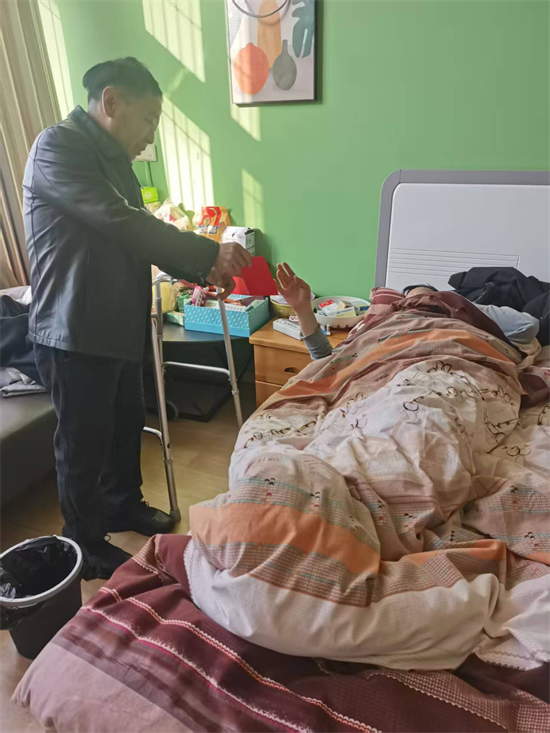 11月26日走访慰问组徒步来到朝阳养老中心,83岁的邹流章老人,其妻于病故多年,2022年由于身患小脑萎缩症,导致多次摔倒,行走困难,现在孤身一人生活在朝阳养老院,生活基本不能自理,精神十分忧愁。此情憬让在场人也十分揪心,慰问组长细致询问老人生活起居情况,叮嘱养老院相关工作人员并拜托给予老人更多关心,多安慰老人、多疏导老人思想方面的困惑。