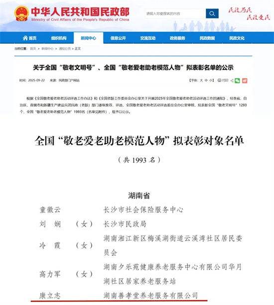 近日,2025 年全国 “敬老爱老助老模范人物” 评选结果正式公布,善孝堂2.0鱼艺福养老董事长康立志凭借在养老服务领域的深耕实践与突出贡献,荣获2025年全国 “敬老爱老助老模范人物” 称号。此项荣誉是对其践行敬老初心、履行社会责任的高度认可,更是对鱼艺福养老深耕养老事业、守护老年群体幸福的肯定。