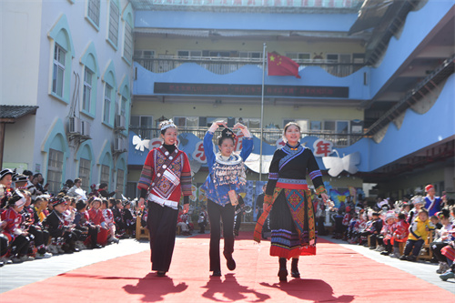 随后的庆祝活动中,各年级组大合唱苗歌,还表演了民族服饰走秀、苗族木鼓舞等富有民族特色的文艺节目,现场气氛热烈。然后,各班孩子们回到教室里,相向而坐,共进苗族长桌宴,年味十足。
