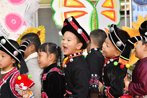 11月25日,贵州省凯里市洗马河街道文化社区,孩子们在幼儿园盛装出席,欢庆苗年。(杨仁海 摄)