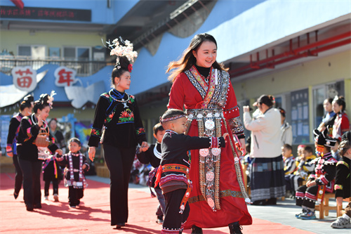 11月25日,贵州省凯里市洗马河街道文化社区,家长与孩子们在幼儿园展示民族服饰,欢庆苗年。(杨仁海 摄)