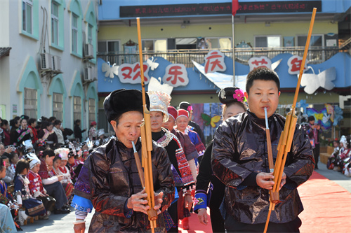 11月25日,贵州省凯里市洗马河街道文化社区,家长助教们在幼儿园吹芦笙,跳芦笙舞,欢庆苗年。(杨仁海 摄)