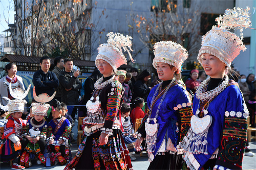11月25日,贵州省凯里市洗马河街道文化社区,教师们在幼儿园展示民族服饰,欢庆苗年。(杨仁海 摄)
