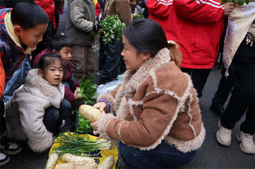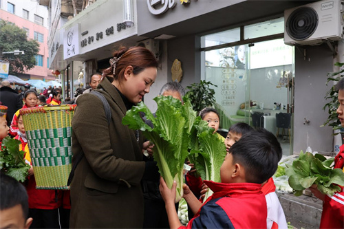 “叔叔,我们的青菜没有打农药,特别新鲜!”“阿姨,买一根萝卜吧,脆脆甜甜的!”孩子们大方地向路人推销,从一开始的羞涩腼腆,到后来的侃侃而谈,每一次成功交易,都伴随着一阵欢呼雀跃。