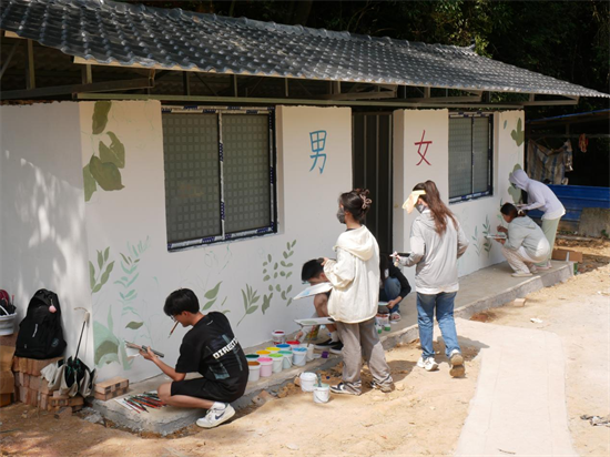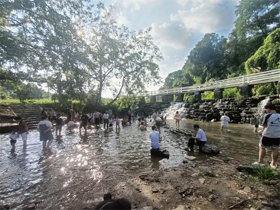 随后,实践团在官町村党总支部书记邱建辉的带领下,来到官町村马鞍堰“网红溯溪打卡点”,通过与往来游客的交流,团队成员了解到,他们很多人都是来自于衡阳市区,带着家人孩子来这避暑乘凉、尽享玩水快乐。大学生实践队员们根据现场观摩和游客反馈,提出了很多优化景点的意见和方案。同时,他们还发挥专业特长,为景点旁的更衣室绘制了精美的墙绘。
