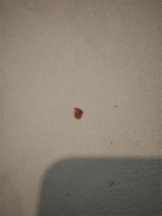 11月29日晚上9时48分,陈树在长沙河西王府井商场一楼野人先生点了山楂冰淇淋,才吃两口感觉咬到一个小石头,舌头也被坚硬的东西刺痛了,吐出来发现一个约0.4公分左右的半透明物体,疑似是砂石(如图)。