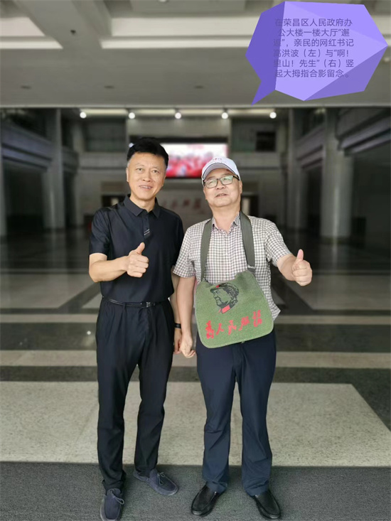 就这样,就在荣昌区人民政府办公大楼一楼的大厅里,不是一般亲民的网红书记高洪波同志,很自然的就与中国民间社会活动家“啊!里山!先生”合影留念了。