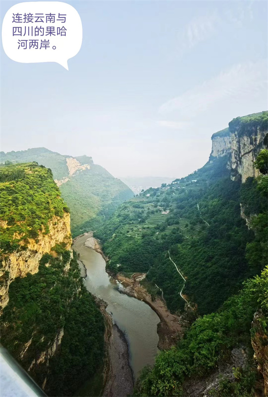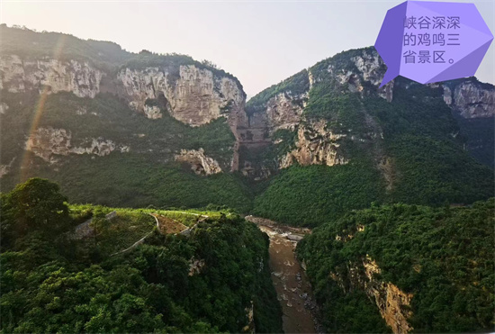 鸡鸣三省饭店几百米下面的赤水河,隔着茂密的果树林和绿油油的玉米地,河流滔滔,峡谷深深。