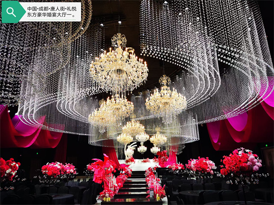 走进婚宴大厅,当美丽的川妹子将电灯打开的那一瞬间,确实,这实在是太令人震撼了,其豪华程度可想而知:礼悦东方•喜之宴环境堪称一绝,从踏入大门的那一刻起就让人喜欢,宴会厅的装修奢华而不失温馨,水晶吊灯闪烁着璀璨的光芒,将整个空间映照得美轮美奂。