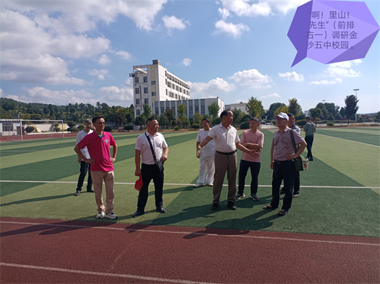 学校就是风景区,金沙五中从学生宿舍到教室到体育场都较为特别。走进校园,一行人首先调研了求知亭,然后来到已有学生上课的课堂外,经过群蛙闹塘景点,最后看了学生宿舍,整个是沿着学校顺时针方向绕了一圈,“啊!里山!先生”对求知亭位置表现出了浓厚兴趣。