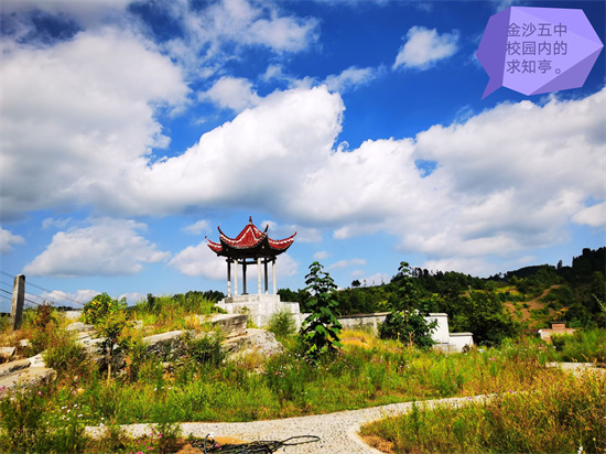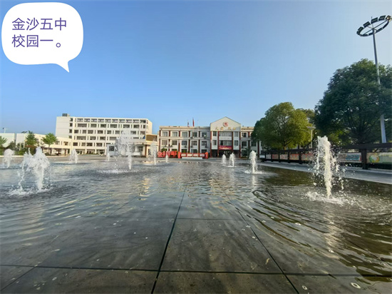 金沙五中学校校园环境优美,亲近自然,依靠学校原有的地理地貌,建造了一个为学生学习和体验亲近自然的环境,以发展为本追求人文环境的和谐统一为出发点,校内郁郁葱葱的树木俯仰生姿,呈现出一派生机勃勃的动人景象。