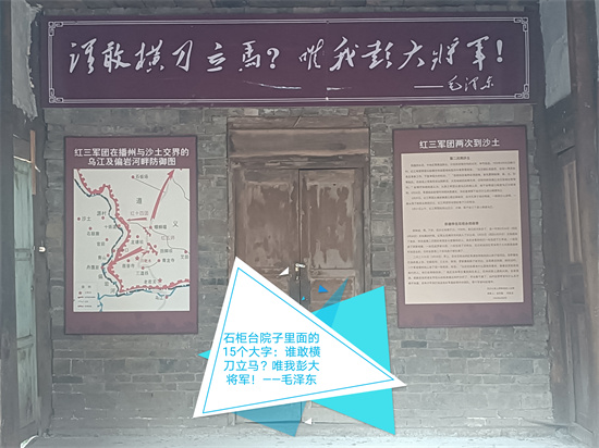 仔细看完墙上的宣传展示,才总算明白过来,原来,90年前的1935年3月底,在中央红军四渡赤水后的南渡乌江前夕,红三军团军团长彭德怀,政委杨尚昆,政治部主任刘少奇,参谋长叶剑英,第十一团政委张爱萍,第十三团团长彭雪枫,以及直属收容队队长胡耀邦等红三军团领导人,都曾在石柜台住过。