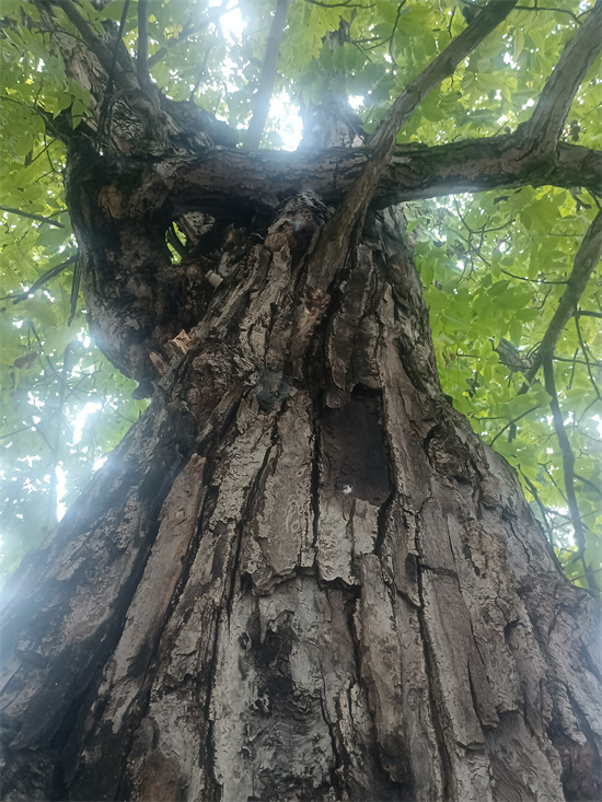 这棵古核桃树,两个人用双手都不能合围,树高看上去要超过50米,树冠覆盖面积在三亩以上,核桃成熟的时候,早些年,可供近二十人同时上树摘核桃。