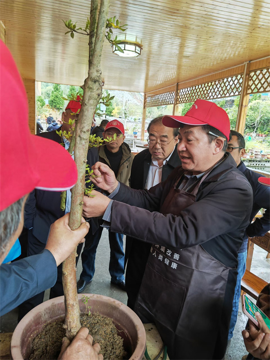 毕节市盆景协会常务副会长朱恒顺,现场作修枝整型实操示范讲解。