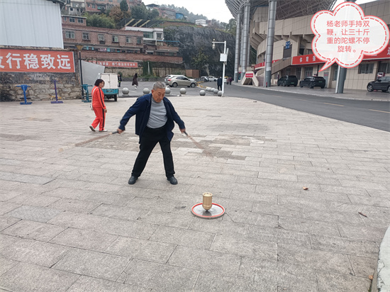 接着杨老师和陈老师双手挥舞着他们手中的鞭子,向六大河栏目记者展示了他们打陀螺的绝活,看着他们蛮有力的镜头、手中的力道、打起陀螺时蹦蹦跳跳的身影以及地面飞速旋转的陀螺,自然就不难理解这几位老师身体是如何的强壮。