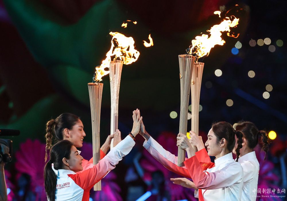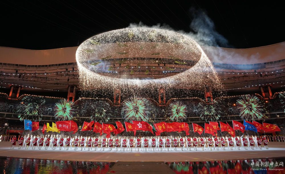 旗手护送中华人民共和国运动会会旗和第十五届全国运动会会旗入场。新华社记者卢汉欣摄