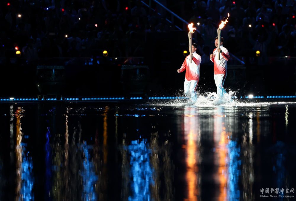 火炬手跑向主火炬台。新华社记者肖艺九摄