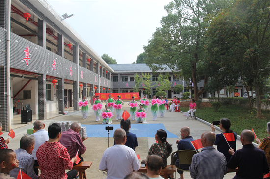 于是,他们于9月29日上午8时半,早早来到了宁家坪养老服务中心如约开展“双献”活动: 陈老板首先向院里的65名老人捐送了人平1份的高档牛奶;紧接着,院长贺云利和工作人员领唱《爱我中华》,拉开文艺演出序幕;罗冬娥率领她的舞队和鹏江广场舞队,分别表演了《没有共产党就沒有新中国》《你是我心中的茉莉花》《花开中国》《红歌联唱》《手心有你》《火辣辣》等文艺节目;老人们边看边挥舞着手中的小红旗,甚至有的合着节拍舞蹈;院里残疾人刘泽芳也乘兴唱了一首《刘海砍樵》花鼓戏歌曲,让这些孤雾老人们看得眉开眼笑,掌声阵阵,连连称好。