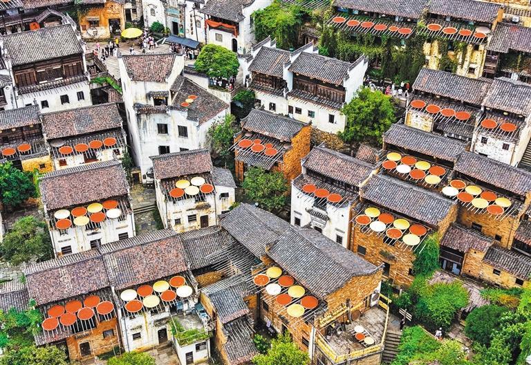 9月21日,江西省上饶市婺源县江湾镇篁岭村,村民用竹匾盛满各色农作物“晒秋”。