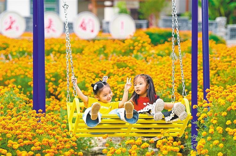 10月12日,小朋友在重庆市酉阳土家族苗族自治县铜鼓镇兴隆村万寿菊花海中游玩。