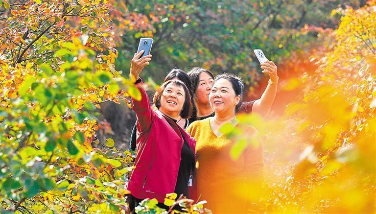 10月14日,游客在河南省禹州市鸠山镇天垌村栗子园沟观赏秋色。