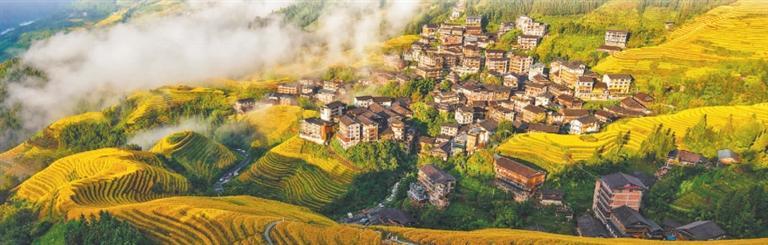 10月14日,在广西壮族自治区桂林市龙胜各族自治县龙脊梯田景区拍摄的梯田云海景观。