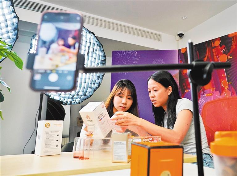 11月10日,海南海口复兴城跨境数据服务产业基地,电商主播在直播间进行准备工作。