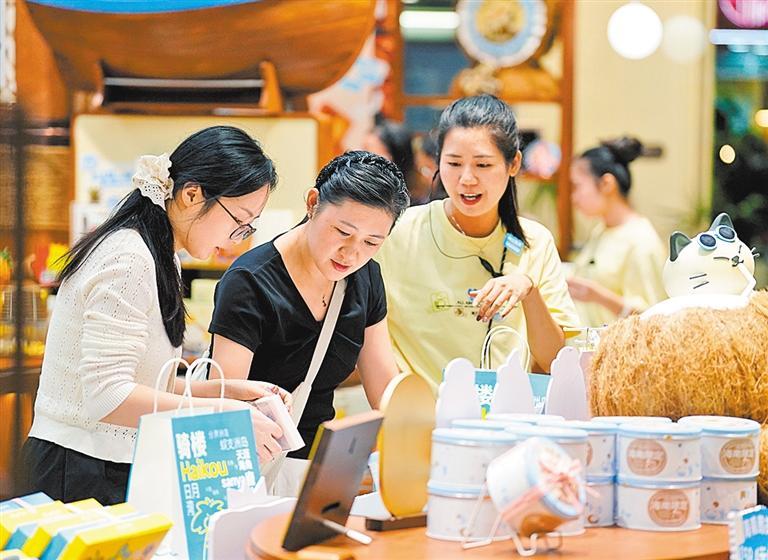 11月10日,游客在海南省海口市骑楼老街选购文创产品。骑楼老街经系统修复后持续创新消费场景,前来选购的游客络绎不绝。