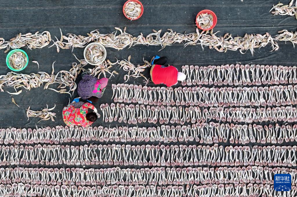 初冬时节,河北省唐山市丰南区黑沿子镇的渔民利用晴好天气,将捕捞的鱼虾等海产品进行加工、晾晒,供应市场。