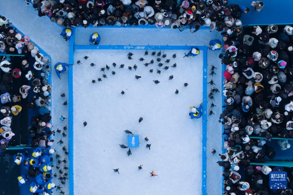 12月13日,人们在哈尔滨极地公园观看企鹅巡游(无人机照片)。