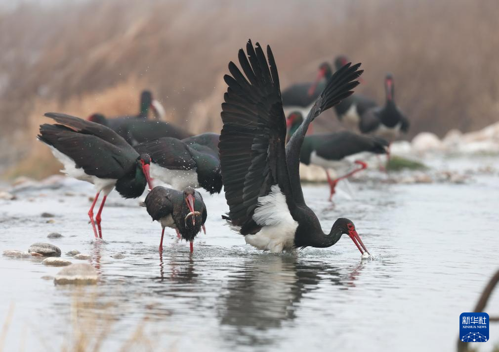 12月19日,一群黑鹳在河北省井陉县境内的绵蔓河内觅食。