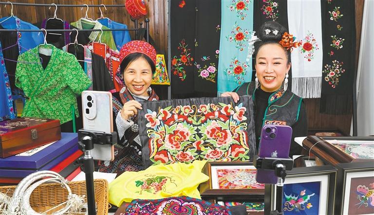 12月9日,贵州省黔东南苗族侗族自治州施秉县,主播在非遗电商直播间推销苗绣产品。在开发式帮扶举措下,当地农民在家门口实现了就业增收。李长华摄(中经视觉)