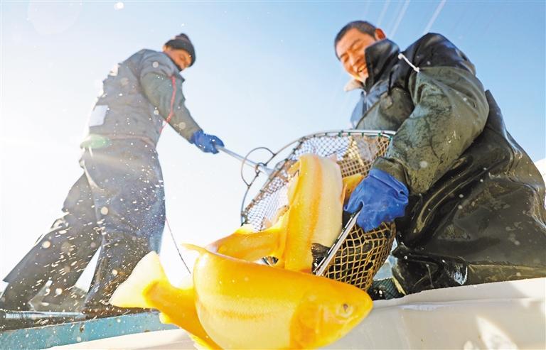 12月25日,山东临沂市郯城县郯城街道十里村特种鱼养殖基地,村民在捕捞金鳟鱼,之后将装运销往上海。 张春雷摄(中经视觉)