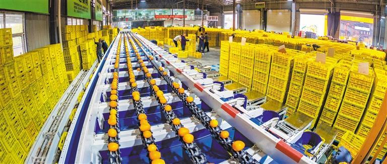 12月12日,湖北省宜昌市秭归县脐橙产业综合物流中心,工人们对脐橙进行分拣打包。 彭 强摄 (中经视觉)