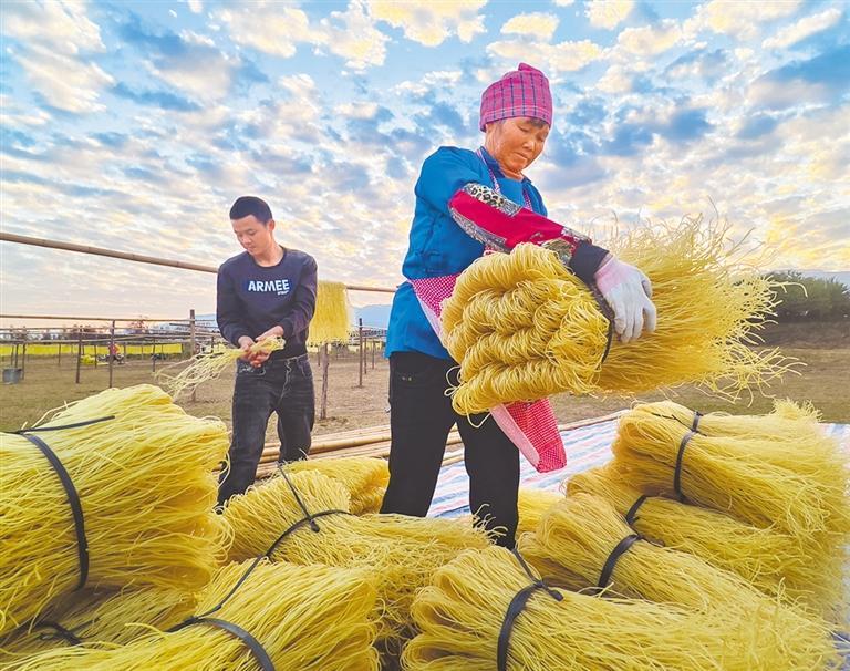12月15日,广西贺州市富川瑶族自治县富阳镇虎头村,村民将晾晒干的粉条打包装车,准备发货。 李成华摄 (中经视觉)