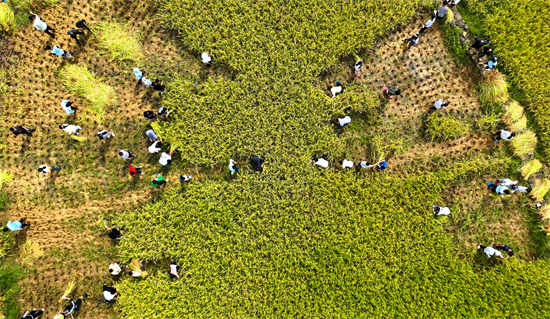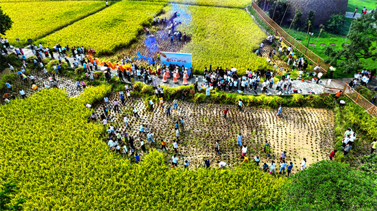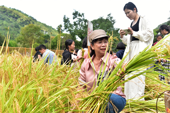 9月15日,2025年张家界黄龙洞秋收节在稻浪翻金的生态田园里开镰启动。适逢其会的中外游客及当地的居民、学生和景区员工共同参加了当天的活动,一起在金黄的田野里同享秋实,共庆丰收。