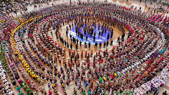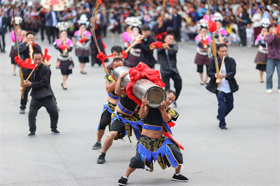9月20日,在贵州省丹寨县,身着传统服饰的群众在巡游展演中跳古瓢琴舞。